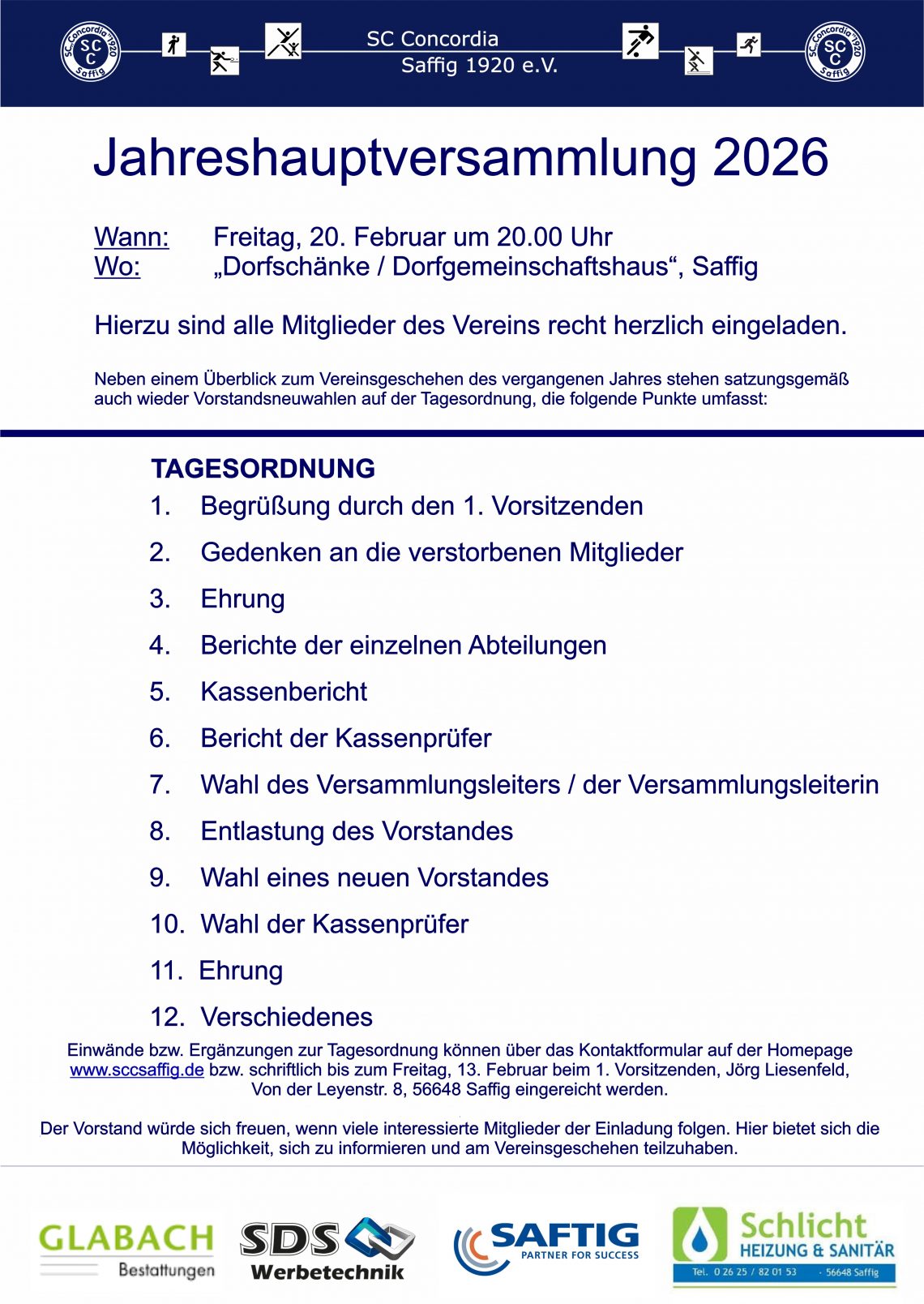 Die Jahreshauptversammlung des SC Concordia Saffig 1920 e. V. findet am Freitag, den 20.02.2026, um 20:00 Uhr in der Dorfschänke/Dorfgemeinschaftshaus in Saffig statt. Hierzu sind alle aktiven und fördernden Mitglieder des Vereins herzlich eingeladen. Neben einem umfangreichen Überblick zum Vereinsgeschehen des vergangenen Jahres und einem Ausblick in das neue Jahr stehen satzungsgemäß auch wieder Vorstandsneuwahlen auf der Tagesordnung. Einwände bzw. Ergänzungen zur Tagesordnung können über das Kontaktformular auf der Homepage www.sccsaffig.de, bzw. schriftlich bis Freitag, 13.02.2026 beim 1. Vorsitzenden Jörg Liesenfeld, Von der Leyenstr. 8, 56648 Saffig, eingereicht werden. Der Vorstand würde sich freuen, wenn viele interessierte Mitglieder der Einladung…