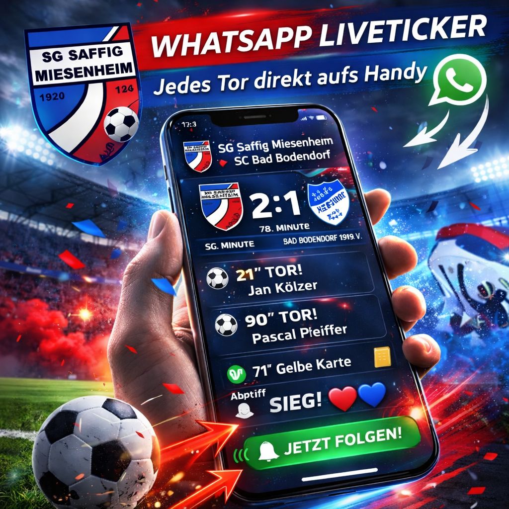Zusätzlich zu unserem bereits bekannten und beliebten Kanal des Vereins auf Whatsapp https://whatsapp.com/channel/0029VbAxmfNJuyAHON9nsA2j stellen wir ab sofort einen Zweiten WhatsApp-Kanal der SG Saffig/Miesenheim mit Liveticker zu unseren Spielen zur Verfügung. Dort bekommt ihr jedes Tor und die aktuellen Spielstände direkt auf euer Handy. Egal ob ihr live vor Ort seid oder nicht dabei sein könnt – mit unserem Liveticker bleibt ihr immer auf dem neuesten Stand. Ob Heimspiel oder Auswärtsspiel – wir versorgen euch während der Spiele mit Updates direkt vom Platz, sodass ihr keinen wichtigen Moment unserer Mannschaft verpasst. 👉 Folgt jetzt unserem WhatsApp-Kanal der Ersten & Zweiten Mannschaft…